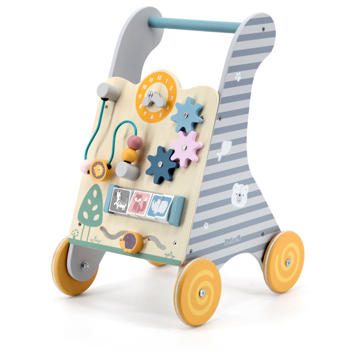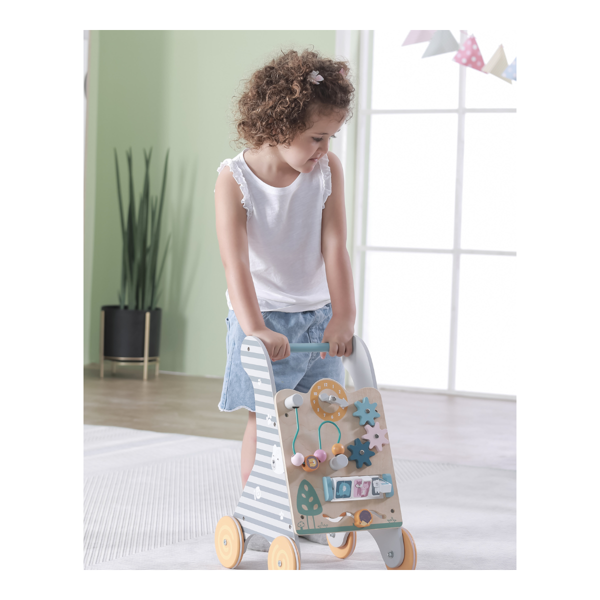 El panel frontal incluye múltiples juegos de motricidad fina — cuentas deslizantes, manecillas móviles, engranajes y piezas manipulables — que favorecen la coordinación mano-ojo, el reconocimiento de colores y formas, así como el desarrollo del pensamiento y la percepción espacial. Gracias a su barra de empuje, el bebé podrá sujetarse y avanzar con confianza mientras desarrolla su equilibrio.