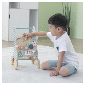 Las ruedas están diseñadas para desplazarse suavemente, lo que permite que el juguete acompañe al bebé sin detener su impulso, mientras el diseño de madera encaja armoniosamente en cualquier ambiente infantil. Cada borde ha sido lijado cuidadosamente para evitar astillas o accidentes, y los tintes y acabados utilizados son aptos para niños.