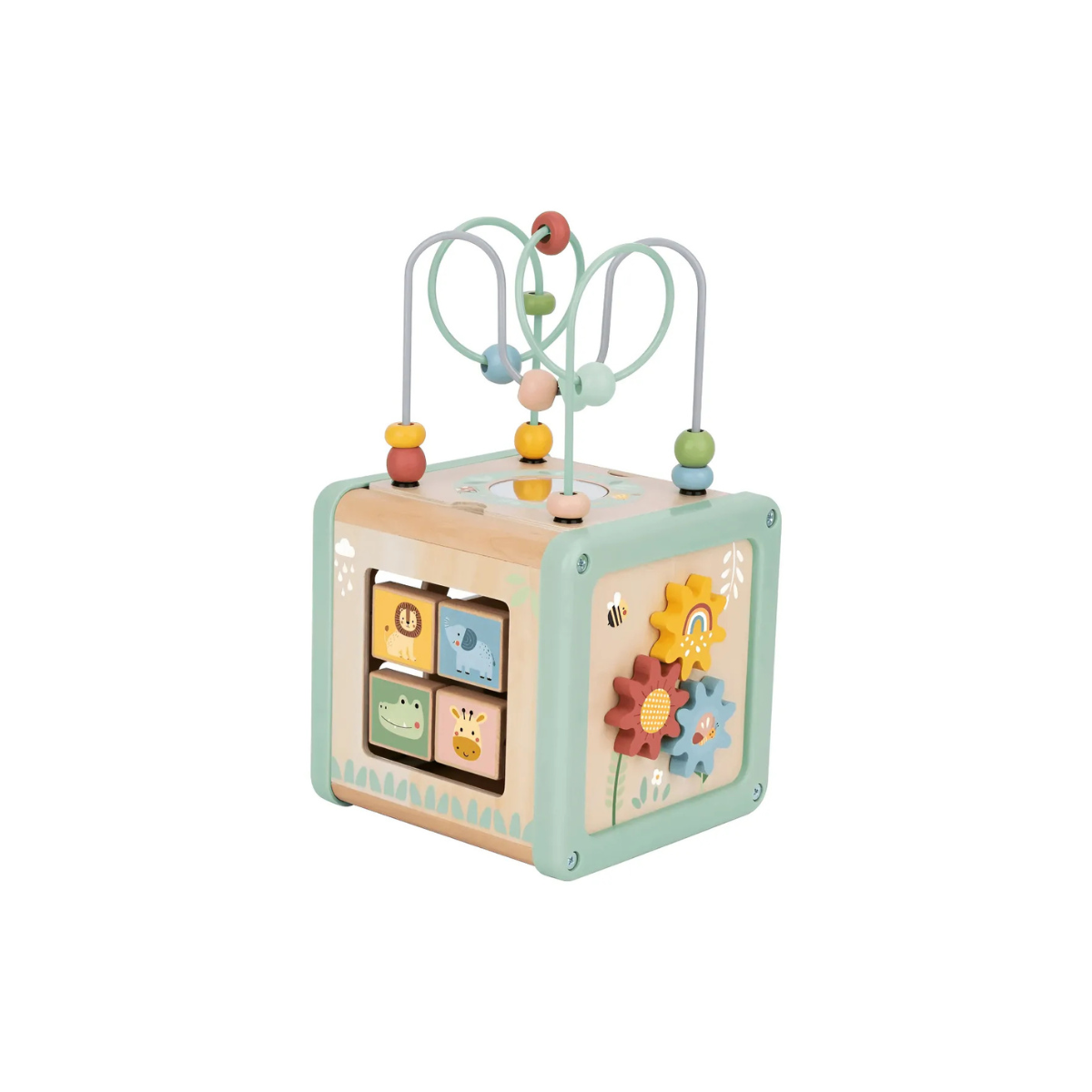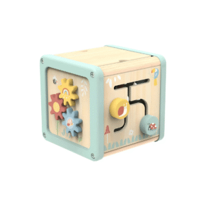 Cada lado del cubo ofrece un nuevo desafío: piezas para encastrar, engranajes, laberintos, cuentas y figuras de colores que invitan a descubrir y aprender jugando 🎨.